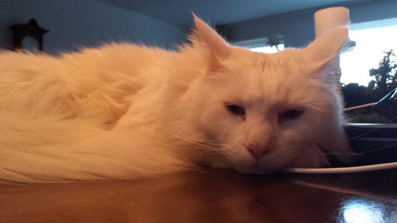 Hetzelfde gebeurt hier ook in huis. Floyd gaat als eerste eten en met zijn volle maag gaat hij heerlijk liggen op de beste plek hier in huis en als het mee zit heerlijk in het zonnetje.