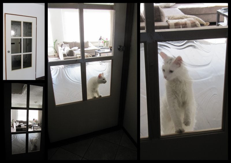 Normaal gesproken zou je de deur eerst helemaal verven voordat je de raampjes erin doet maar we hebben twee katten (waarvan eentje het snelst is) die het fijn vinden om in het halletje te zitten. Als je dan de voordeur opendoet zitten ze al buiten. Of je doet de deur open omdat iemand voor de deur staat en floeppen ze ook al door je benen door. Ze kunnen nu niet zo makkelijk naar de hal en dat vind ik wel een heel geruststellend gevoel.